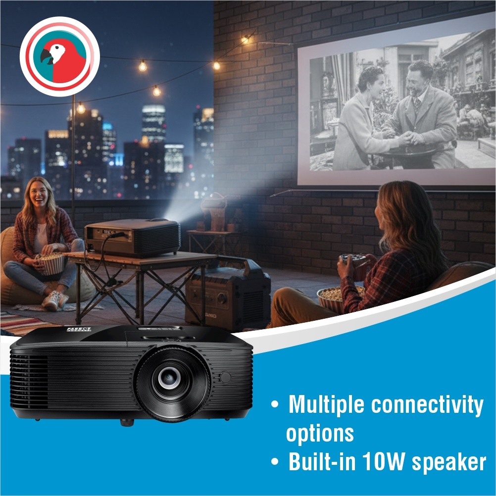 The Parrot Projector OPS336 is a high-performance SVGA projector designed for classrooms and meeting rooms. With a powerful 4000 ANSI lumens brightness and a 25,000:1 contrast ratio, it delivers vibrant, clear presentations even in well-lit environments. Its DLP™ technology ensures sharp image quality at a native resolution of 800×600 (SVGA), supporting aspect ratios of 4:3 and 16:9.